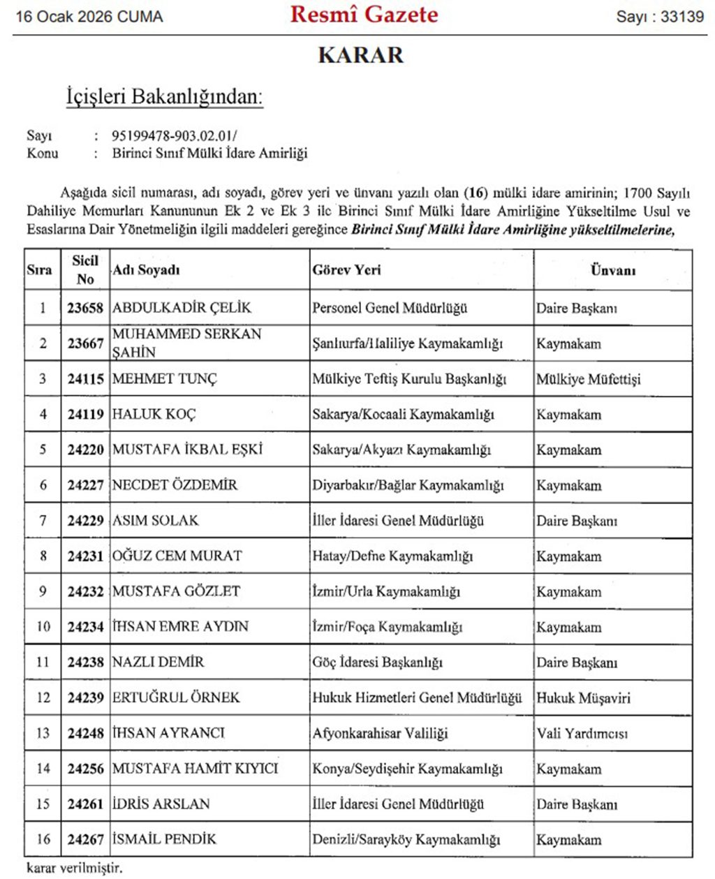İçişleri Bakanlığı’nın yayımlamış olduğu karara göre; aralarında mülkiye müfettişi, kaymakam ve daire başkanlarının da yer aldığı 16 mülki idare amiri, birinci sınıf mülki idare amiri görevine yükseltildi.