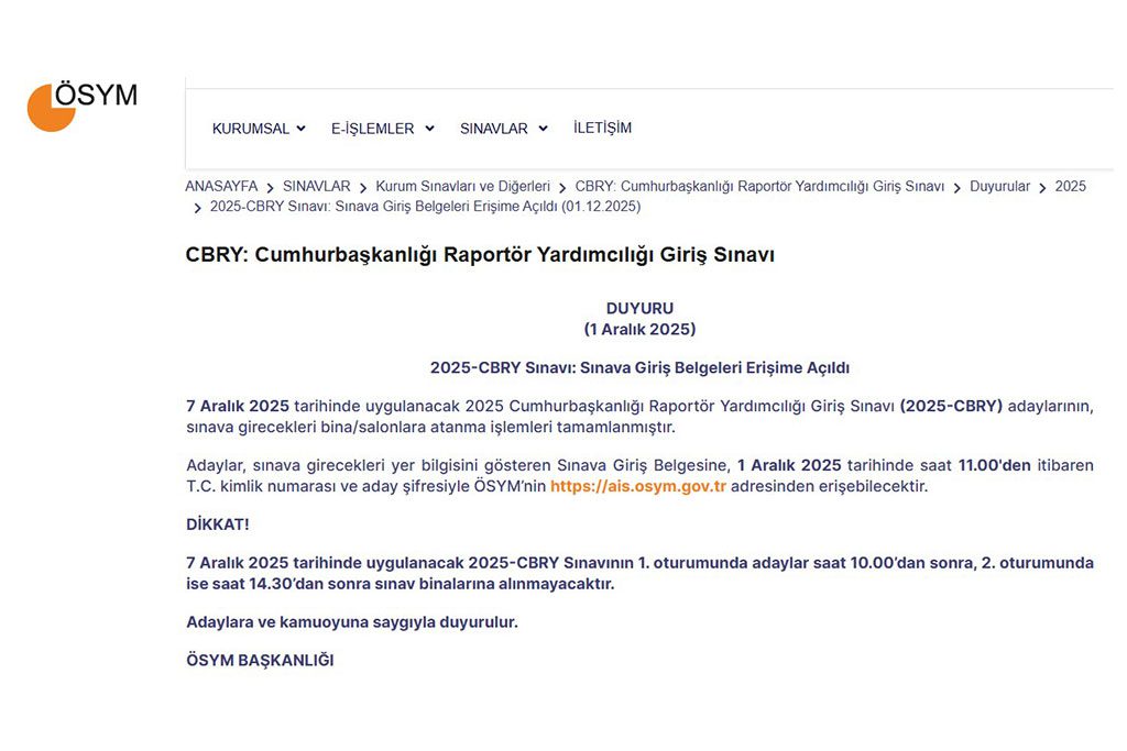 Ek olarak; Ölçme, Seçme ve Yerleştirme Merkezi tarafından yapılan sınav uyarısında ise; Cumhurbaşkanlığı Raportör Yardımcılığı Sınavı’nın ilk oturumunun 7 Aralık 2025 tarihinde saat 10:00’da başlayacağı bildirildi.