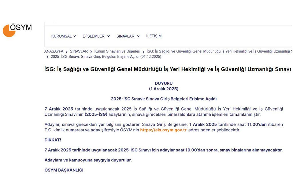 1 Aralık 2025 tarihi itibarıyla, saat 11:00’dan sonra Ölçme, Seçme ve Yerleştirme Merkezi resmi internet sitesi Aday İşlemleri Sistemi üzerinden 2025-İSG sınav giriş belgelerine erişim sağlanabilecektir.