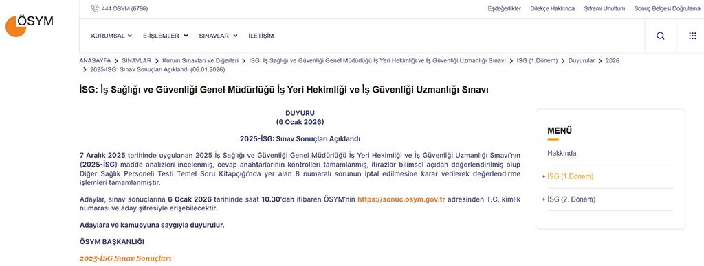 ÖSYM tarafından yapılan açıklamaya göre; 6 Ocak 2026 tarihinde saat 10:30 itibarıyla 2025- İSG sonuçları sorgulama ekranı erişime açılmıştır.