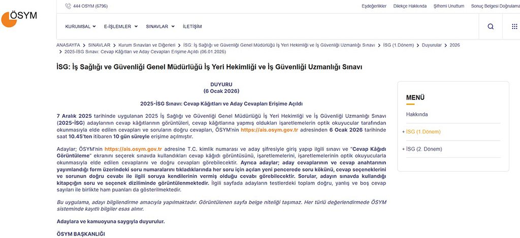 7 Aralık 2025 tarihinde ülke genelinde gerçekleştirilen 2025 İş Sağlığı ve Güvenliği Genel Müdürlüğü İş Yeri Hekimliği ve İş Güvenliği Uzmanlığı Sınavı ile ilgili önemli bir duyuru yayımlandı.
