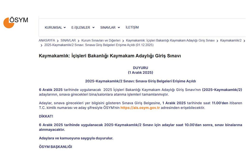 1 Aralık 2025 tarihinde saat 11:00 itibarıyla erişime açılan 2025-Kaymakamlık/2 sınav giriş belgeleri, Ölçme, Seçme ve Yerleştirme Merkezi Aday İşlemleri Sistemi üzerinden görüntülenebilecektir.