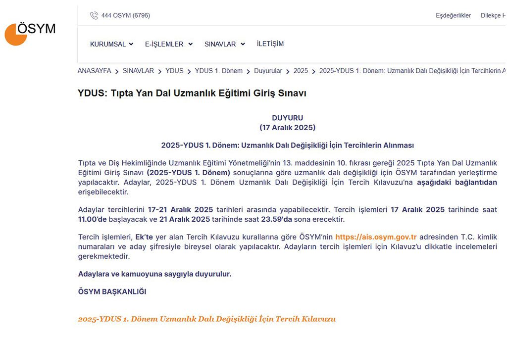 Ölçme, Seçme ve Yerleştirme Merkezi (ÖSYM) tarafından yapılan açıklama ile beraber Tıpta ve Diş Hekimliğinde Uzmanlık Eğitimi Yönetmeliği’nin 13. maddesinin 10. fıkrası kapsamına göre; 2025 yılı Tıpta Yan Dal Uzmanlık Eğitimi Giriş Sınavı olarak da bilinen 2025 YDUS 1. dönem sonuçlarına bağlı olarak uzmanlık dalı değişikliği için tercihler alınmaya başlandı.