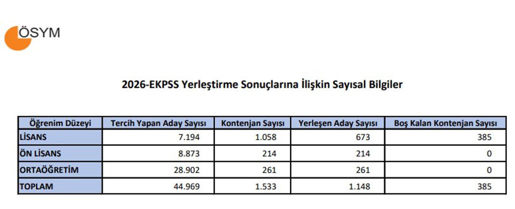EKPSS 2026 Merkezi Atama Kapsamında Boş Kalan Kontenjan Sayısı