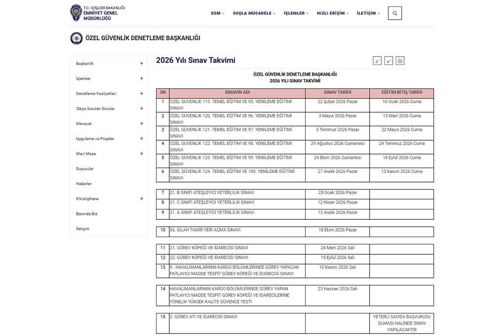• Özel güvenlik 123. temel eğitim ve 99. yenileme eğitimi sınavı 24 Ekim 2026 tarihinde Cumartesi günü yapılacaktır.