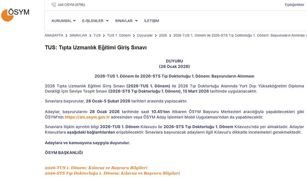 Ölçme, Seçme ve Yerleştirme Merkezi (ÖSYM) resmi internet sitesi üzerinden yeni bir duyuru yayımlandı ve 2026 TUS 1.dönem ve 2026 STS tıp doktorluğu 1.dönem başvuruları başladı. İşte detaylar.
