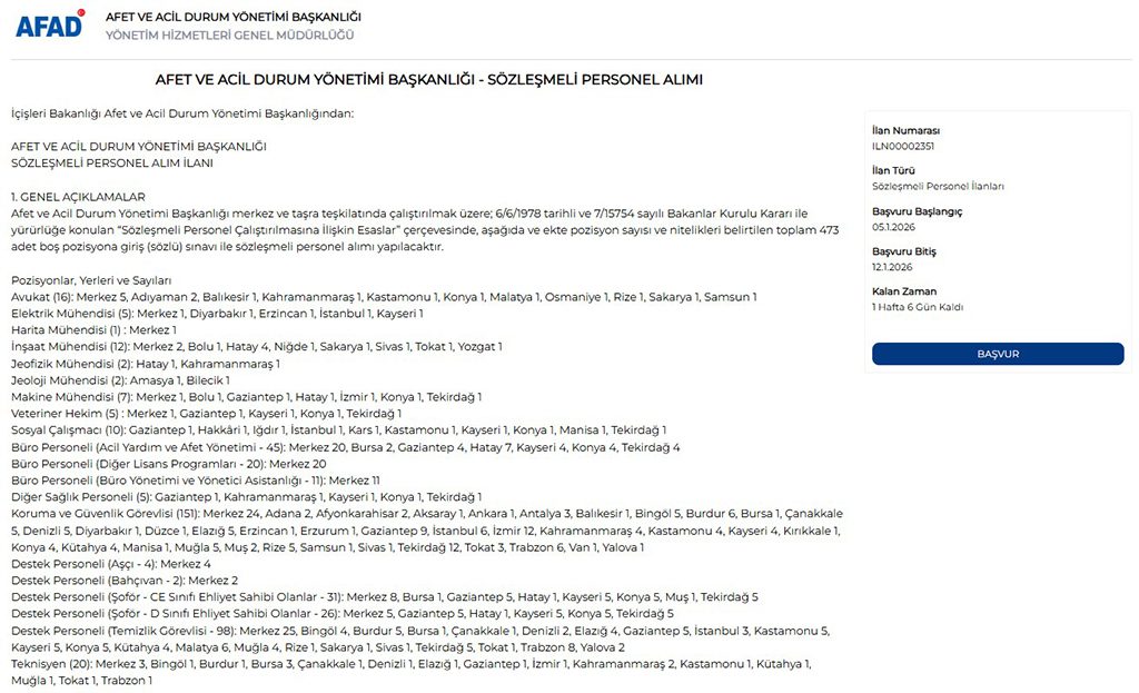 AFAD’ın bünyesinde istihdam edeceği 473 sözleşmeli personel alımı iş ilanı kapsamında; başvurular 5 Ocak 2026 tarihinde saat 10:00’da alınmaya başlanacaktır ve 12 Ocak 2026 tarihinde saat 17:00’de başvurular sona erecektir.