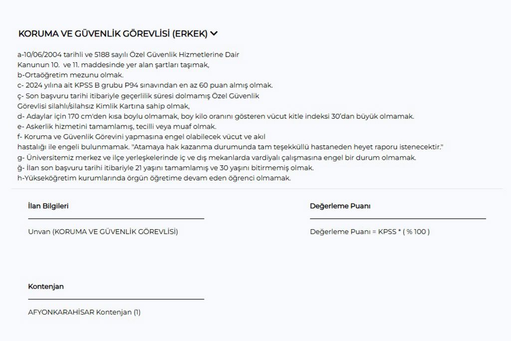 Ayrıca Afyon Kocatepe Üniversitesi istihdam ilanına başvurularda genel şartlar ve bildirilen açık pozisyonlar için özel şartlar da bulunuyor.