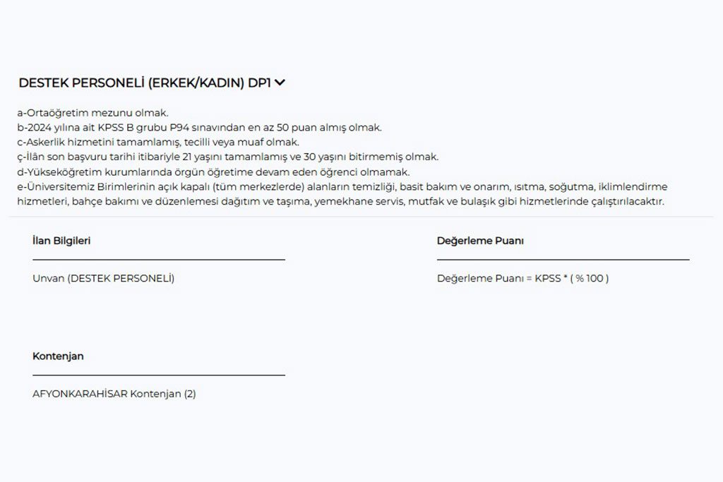 Afyon Kocatepe Üniversitesi tarafından yapılan açıklamaya göre, personel olarak istihdam edilecek bireyler, Üniversite Rektörlüğüne bağlı birimlerde görevlendirilebileceklerdir.