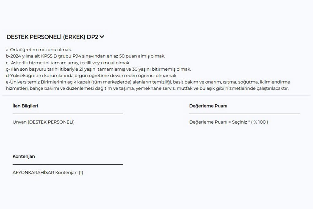 Afyon Kocatepe Üniversitesi 4 sözleşmeli personel alımı ilanına başvuru yapacak adaylar, 2024 yılı Kamu Personeli Seçme Sınavı (KPSS) B Grubu KPSSP94 puanına sahip olmak zorundadır.