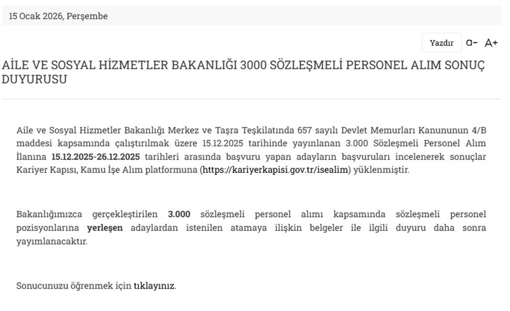 “Aile ve Sosyal Hizmetler Bakanlığı Merkez ve Taşra Teşkilatında 657 sayılı Devlet Memurları Kanununun 4/B maddesi kapsamında çalıştırılmak üzere 15.12.2025 tarihinde yayınlanan 3.000 Sözleşmeli Personel Alım İlanına 15.12.2025-26.12.2025 tarihleri arasında başvuru yapan adayların başvuruları incelenerek sonuçlar Kariyer Kapısı, Kamu İşe Alım platformuna (https://kariyerkapisi.gov.tr/isealim) yüklenmiştir.