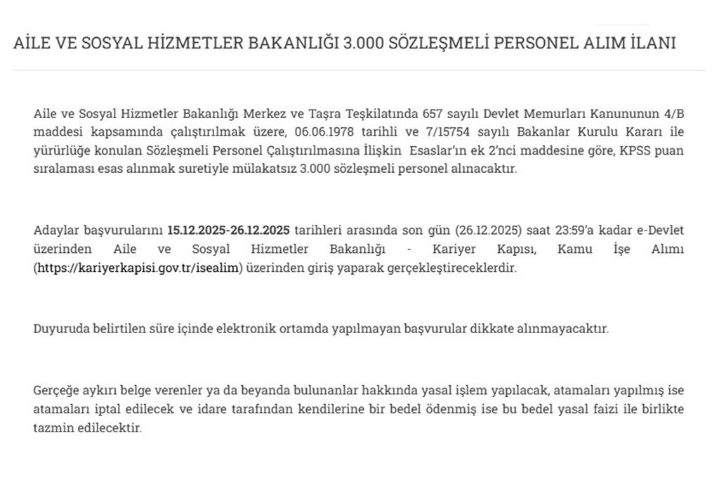 Aile ve Sosyal Hizmetler Bakanlığı tarafından yapılan son açıklamaya göre, yeni personel alımı yapılacaktır. Aile ve Sosyal Hizmetler Bakanlığı 3 bin personel alımı iş ilanına başvurular 15 Aralık 2025 tarihinde başladı ve 26 Aralık 2025 tarihinde sona erecektir.