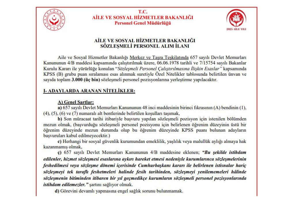 Aile Ve Sosyal Hizmetler Bakanlığı, KPSS puan sıralaması ile 3 bin sözleşmeli personel alımı yapacağını duyurdu.