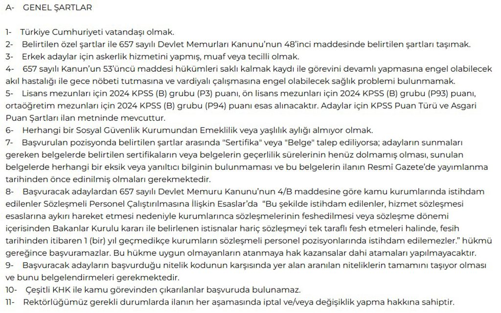 Lisans mezunları için, 2024 yılı KPSS (B) gurubu P3 puan şartı esas alınacaktır.