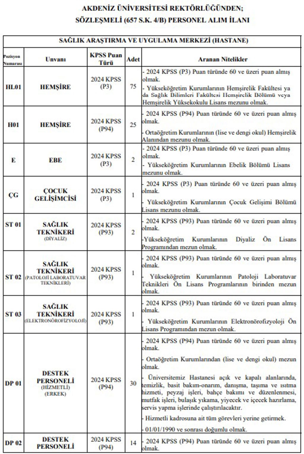 Akdeniz Üniversitesi Sağlık Araştırma ve Uygulama Merkezi (Hastane) bünyesine 152 kişi alınacaktır.