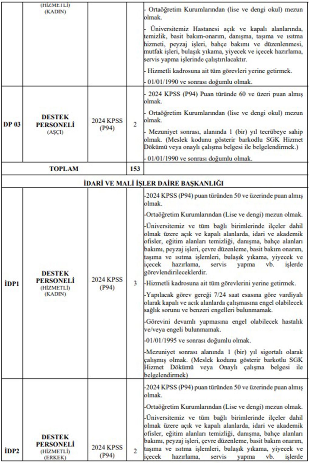 • Erkek – hizmetli destek personeli: 30 kişi