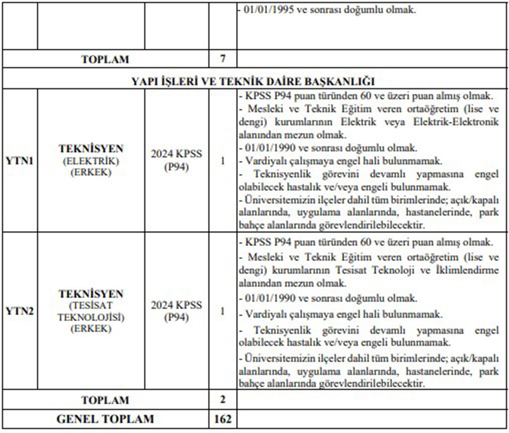 Alt kısımda Akdeniz Üniversitesi’nin 162 personel alımı kadro dağılımını inceleyebilirsiniz.