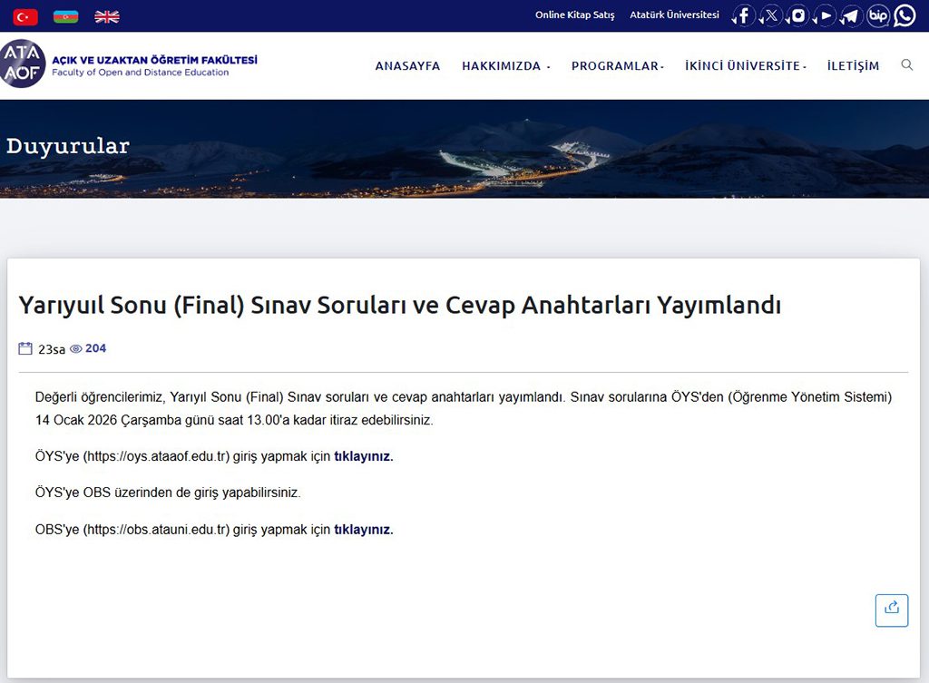 Atatürk Üniversitesi Açıköğretim Fakültesi güz dönemi final sınavları, 10-11 Ocak 2026 tarihinde yapılmıştı.