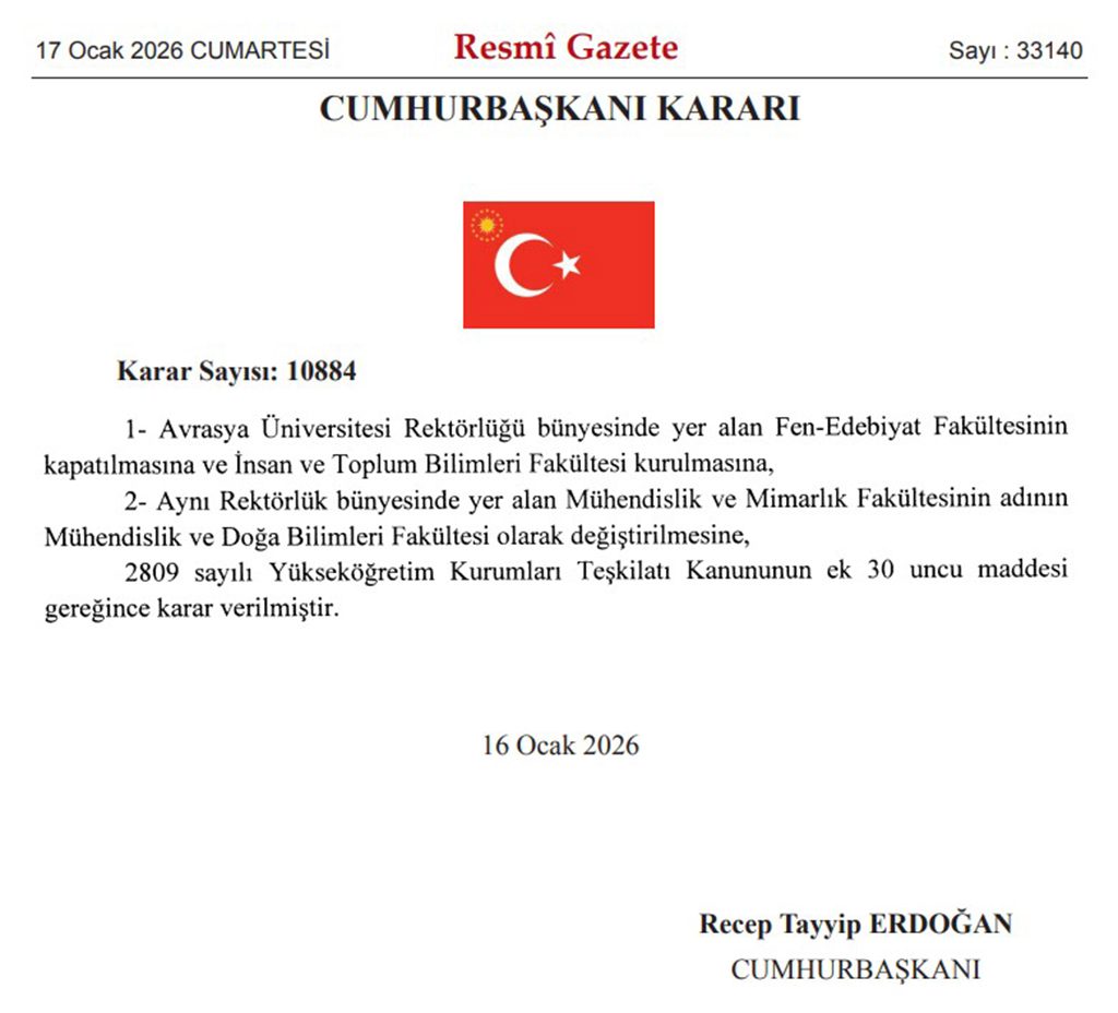17 Ocak 2026 tarihli ve 33140 sayılı Resmi Gazete’de yayımlanan “Avrasya Üniversitesi Rektörlüğü Bünyesinde Yer Alan Fen-Edebiyat Fakültesinin Kapatılması ve İnsan ve Toplum Bilimleri Fakültesi Kurulması, Aynı Rektörlük Bünyesinde Yer Alan Mühendislik ve Mimarlık Fakültesinin Adının Mühendislik ve Doğa Bilimleri Fakültesi Olarak Değiştirilmesi Hakkında Karar (Karar Sayısı: 10884)” kapsamına göre; Avrasya Üniversitesi’nde fakülte kapatılması ve yeni fakülte kurulması kararlaştırıldı.