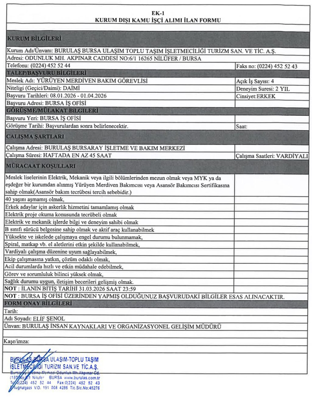 BURULAŞ “yürüyen merdiven bakım görevlisi” görevi için 4 daimi işçi alacaktır.
