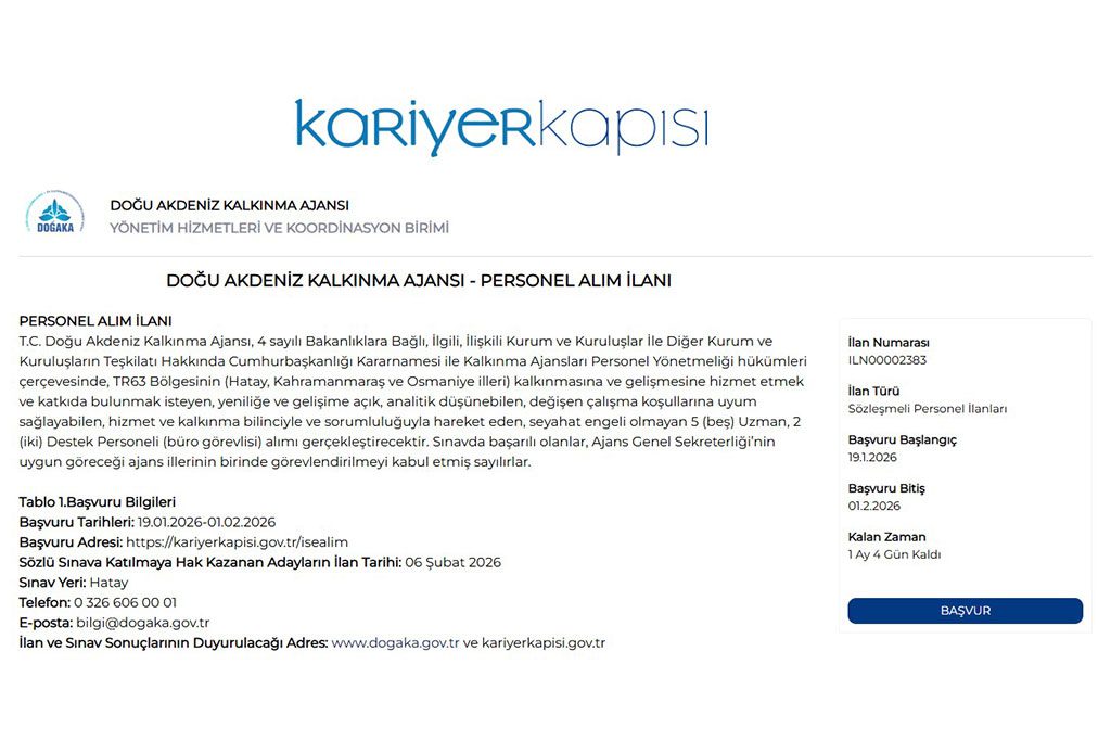 Doğu Akdeniz Kalkınma Ajansı 7 personel alımı kapsamında başvuru yapacaklar; 19 Ocak 2026 tarihinde başvuru yapmaya başlayabilirler. İlanın son başvuru tarihi ise; 1 Şubat 2026 23:59’a kadar olarak açıklandı.