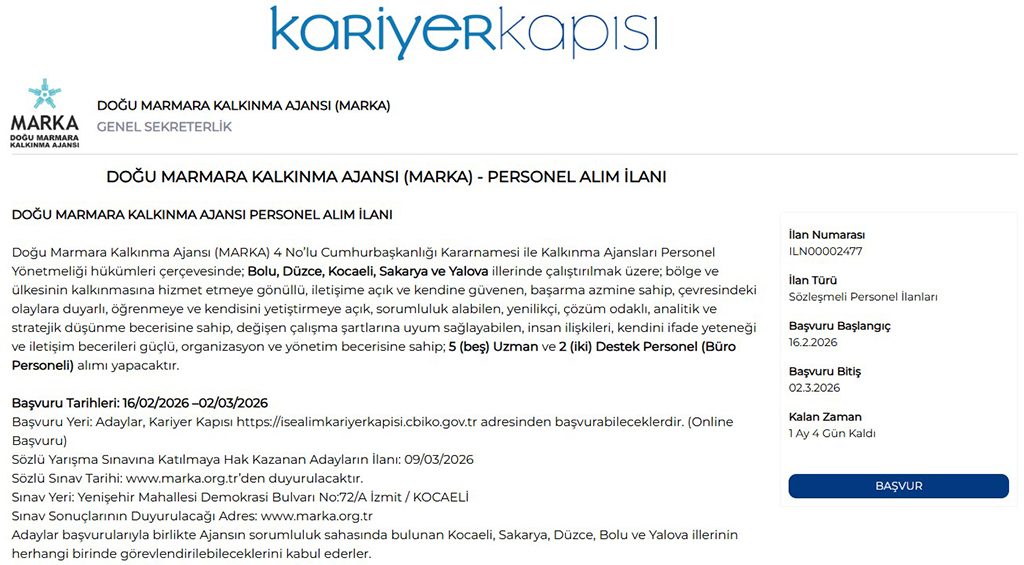Doğu Marmara Kalkınma Ajansı (MARKA) tarafından yayımlanan iş ilanına başvuru yapmak için belirlenen tarih 16 Şubat 2026 tarihinde başlayacaktır ve 2 Mart 2026 tarihinde sona erecektir.