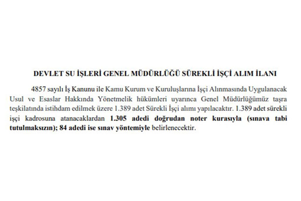 Devlet Su İşleri Genel Müdürlüğü’nün 1389 sürekli işçi kadrosunun tamamı noter huzurunda kura ile belirlenecektir.