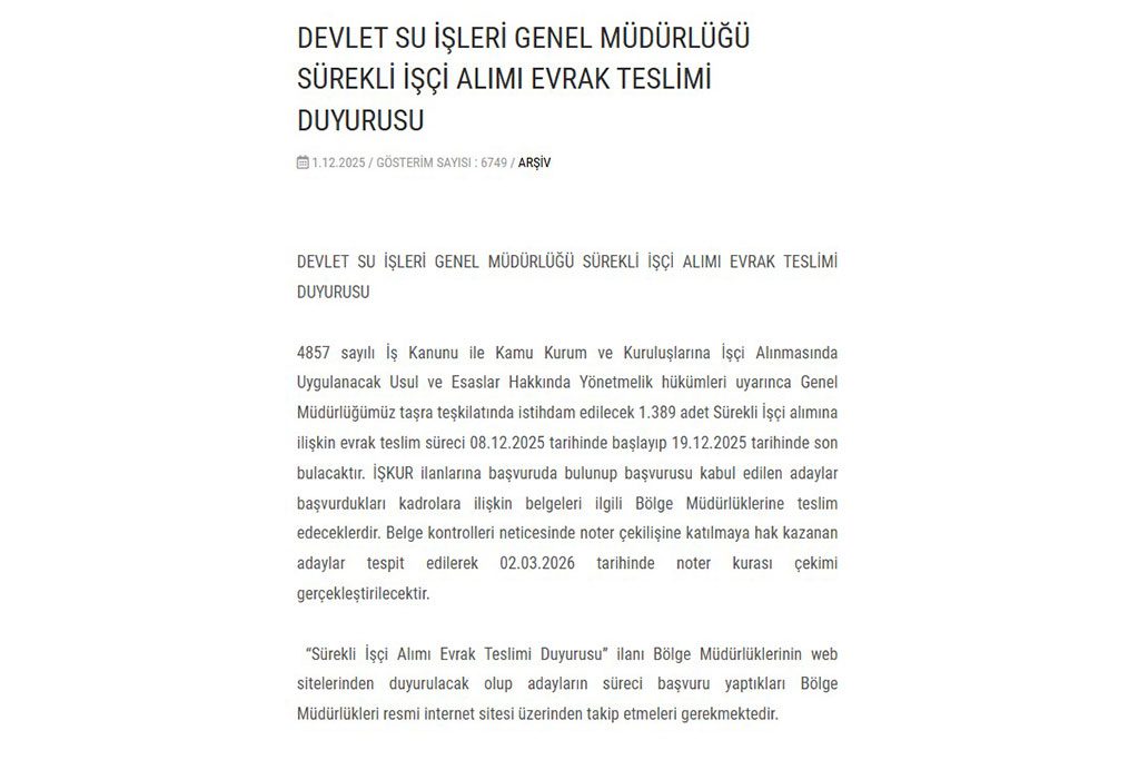 Devlet Su İşleri Genel Müdürlüğü 1389 sürekli işçi alımı kapsamında gerçekleştirilecek kura çekim tarihi ise 2 Mart 2026 olarak açıklandı.