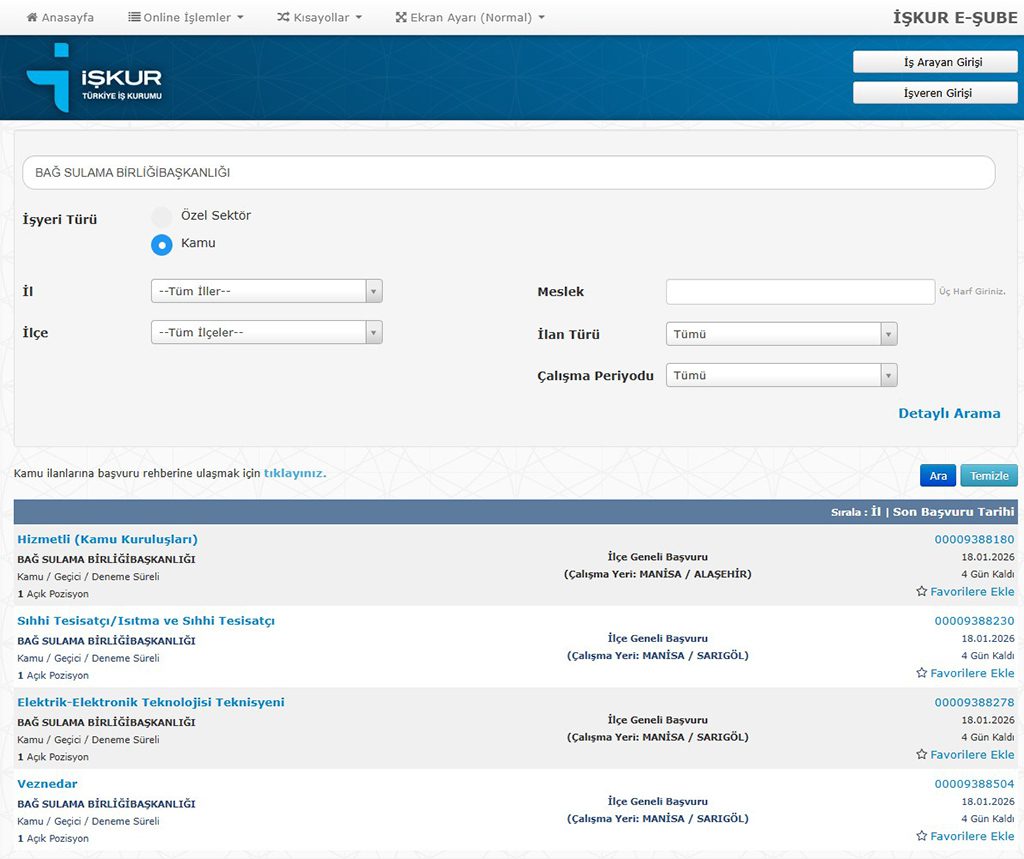 Türkiye İş Kurumu (İŞKUR) resmi internet sitesi üzerinden yayımlanan ilanlara başvurular 18 Ocak 2026 tarihine kadar alınacaktır.