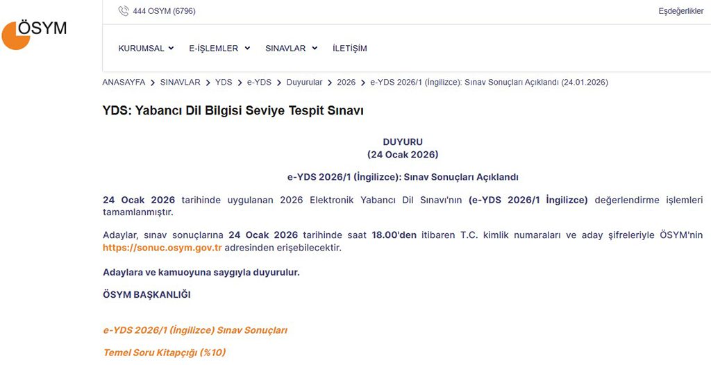 Ölçme, Seçme ve Yerleştirme Merkezi (ÖSYM) resmi internet sitesi üzerinden yapılan açıklamaya göre; 24 Ocak 2026 tarihinde saat 18:00 itibarıyla e-YDS 2026/1 İngilizce sınav sonuçları sorgulama ekranı üzerinden sınav sonuçlarının kontrol edilebileceği bildirilmiştir.