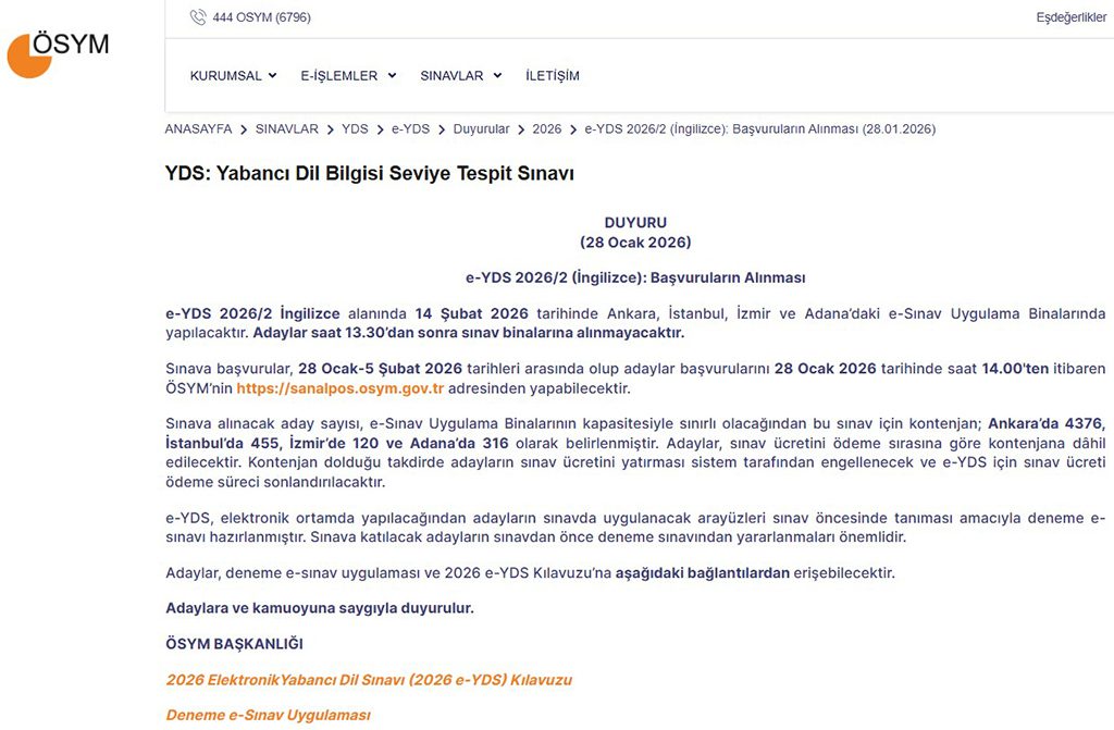 e-YDS 2026/2 ingilizce başvuruları 28 Ocak 2026 tarihi 14:00 itibarıyla alınmaya başlandı ve 5 Şubat 2026 tarihinde sona erecektir.