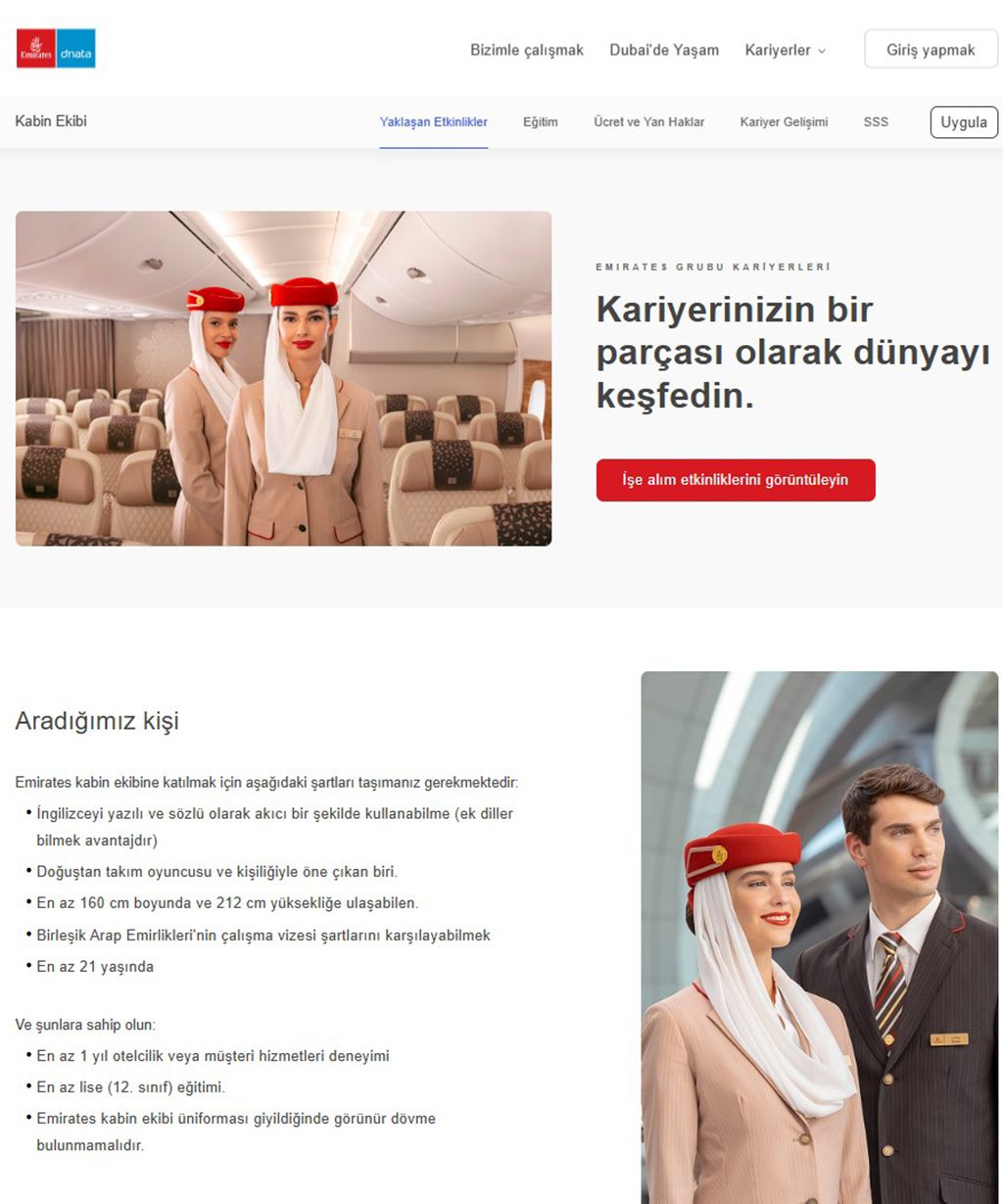 Emirates kabin memuru alımı kapsamında yayımlanan duyuruya göre; erkek ve kadın kabin ekibi personeli alımı yapılacaktır.