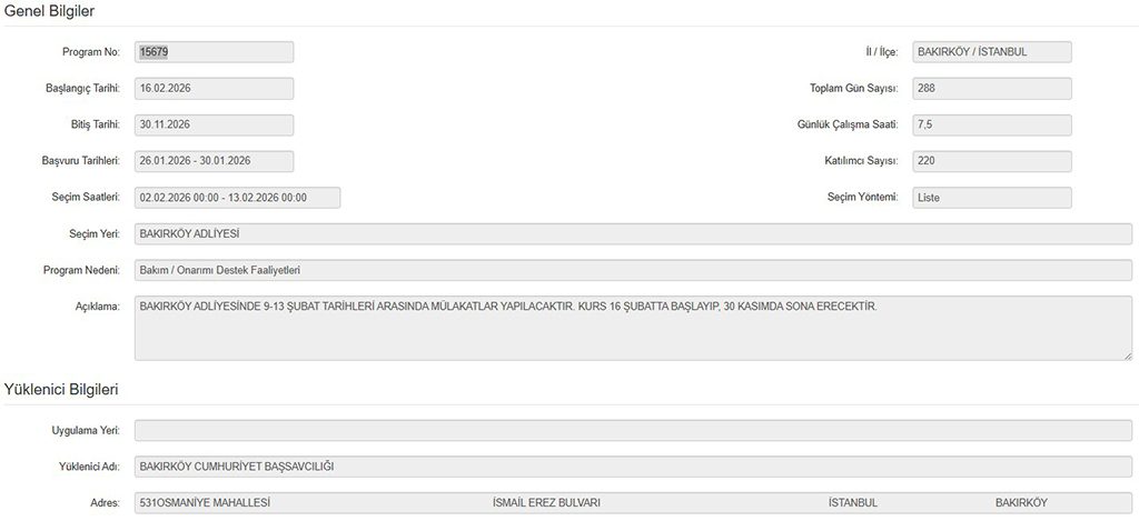 İşe alınacak kişiler 16 Şubat 2026 tarihinde iş başı yapacak ve 30 Kasım 2026 tarihinde iş akdi sona erecektir.