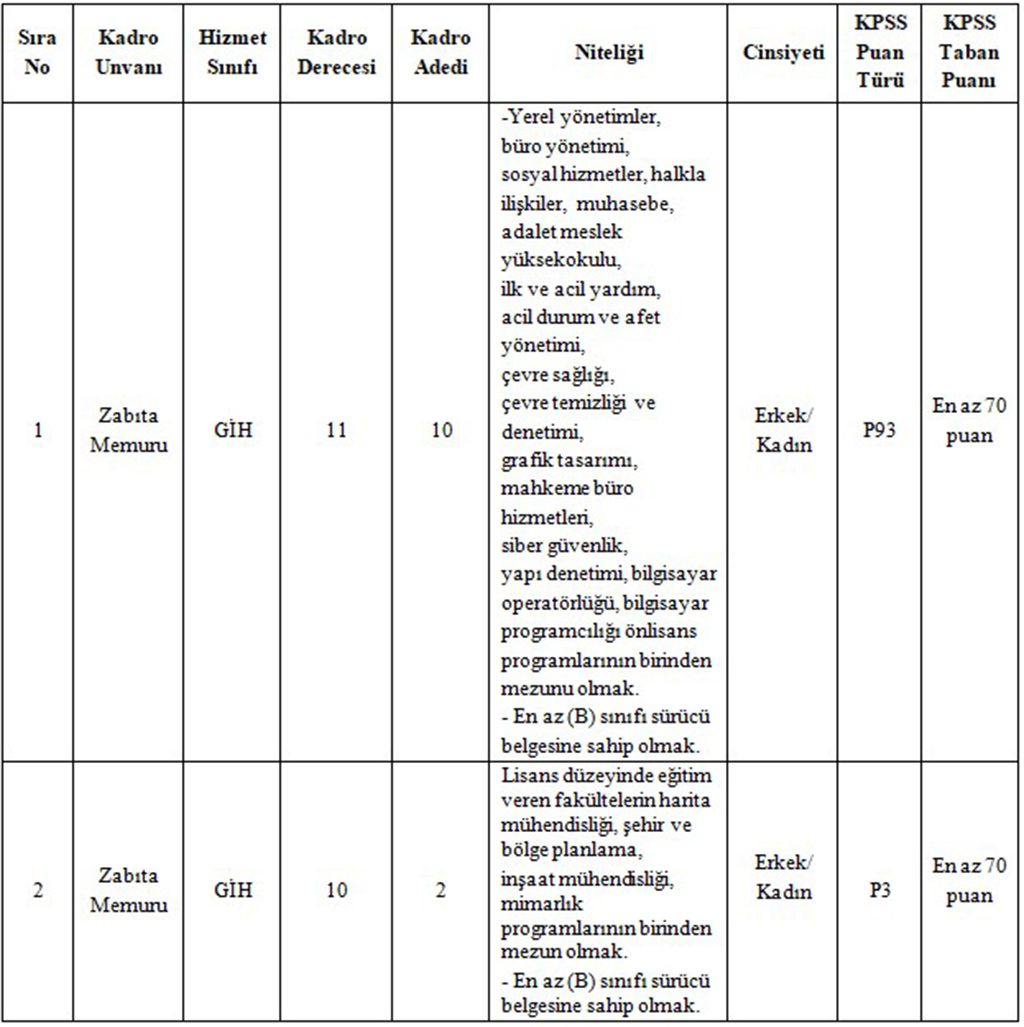 - Erkek Ve Kadın Ön Lisans 10 Zabıta Memuru Alımı – KPSS P93 En az 70 Puan İle: Büro yönetimi, yerel yönetimler, muhasebe, sosyal hizmetler, adalet meslek yüksekokulu, halkla ilişkiler, acil durum ve afet yönetimi, ilk ve acil yardım, çevre temizliği ve denetimi, çevre sağlığı, mahkeme büro hizmetleri, grafik tasarımı, siber güvenlik, bilgisayar programcılığı, bilgisayar operatörlüğü ve yapı denetimi bölümlerinden birinden mezun olmak ve en az B sınıfı ehliyete sahip olmak.