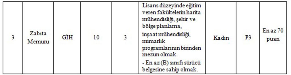 - Kadın Lisans 3 Zabıta Memuru Alımı – KPSS P3 En az 70 Puan İle: Harita Mühendisliği, mimarlık, şehir ve bölge planlama ile inşaat mühendisliği bölümlerinden birinden mezun olmak ve en az B sınıfı ehliyete sahip olmak.