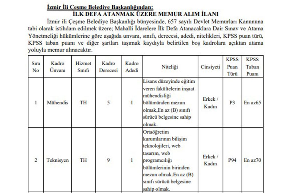 İzmir ili Çeşme Belediyesi memur alımı iş ilanı içerisinde yer alan detaylara göre; mühendis ve teknisyen kadrolarına memur alımı gerçekleştirileceği bildirildi.