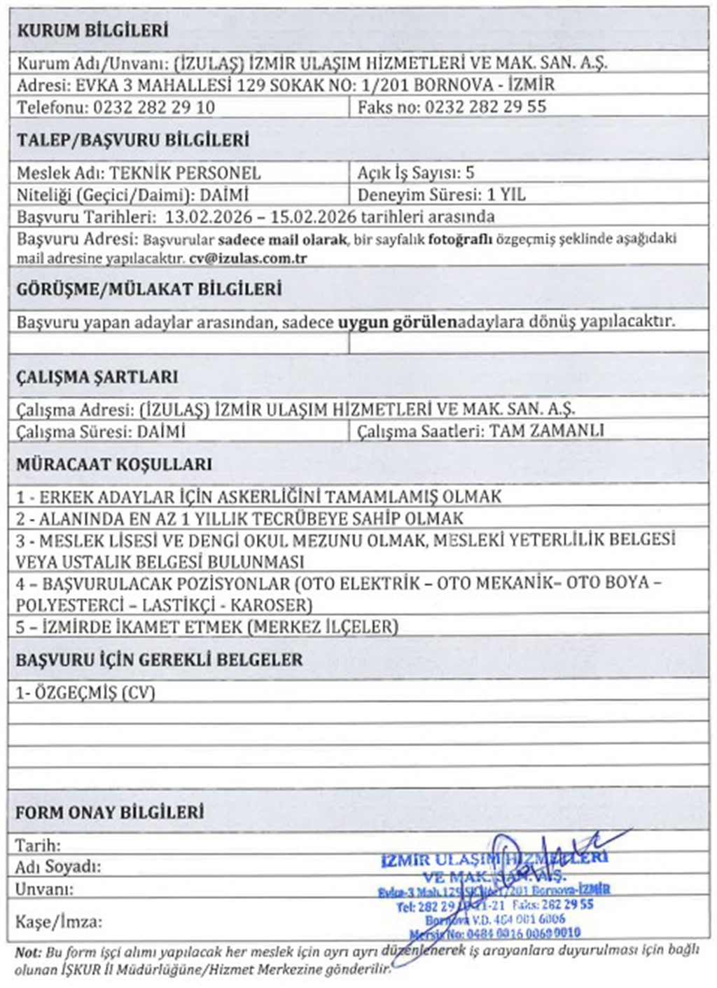 Yayımlanan ilanda talep edilen başvuru şartlarına uygun olan adaylara İZULAŞ tarafından geri dönüş yapılacağı bildirilmiştir.
