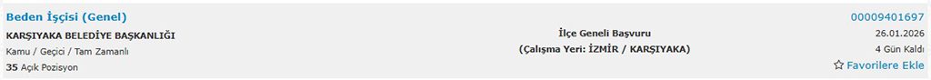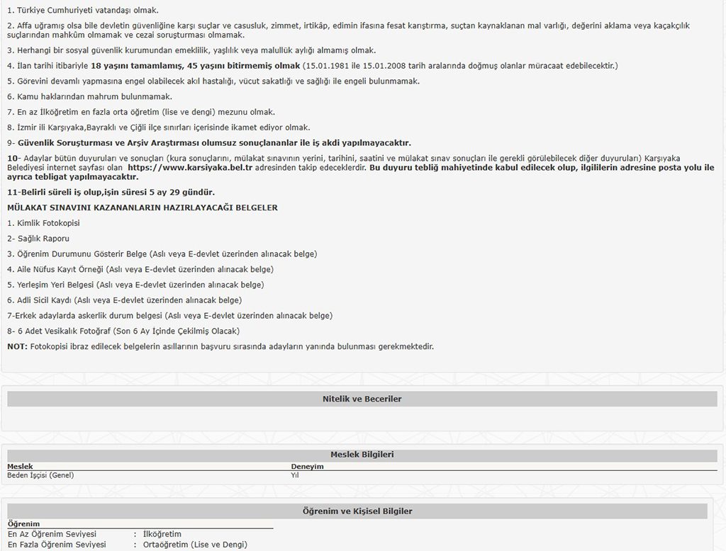 İzmir Karşıyaka Belediyesi bünyesinde işe alınacak kişiler, 5 ay 29 gün süreli (geçici) işçi statüsünde görev alacaktır ve meslek grubu ise “beden işçisi” olarak açıklanmıştır.
