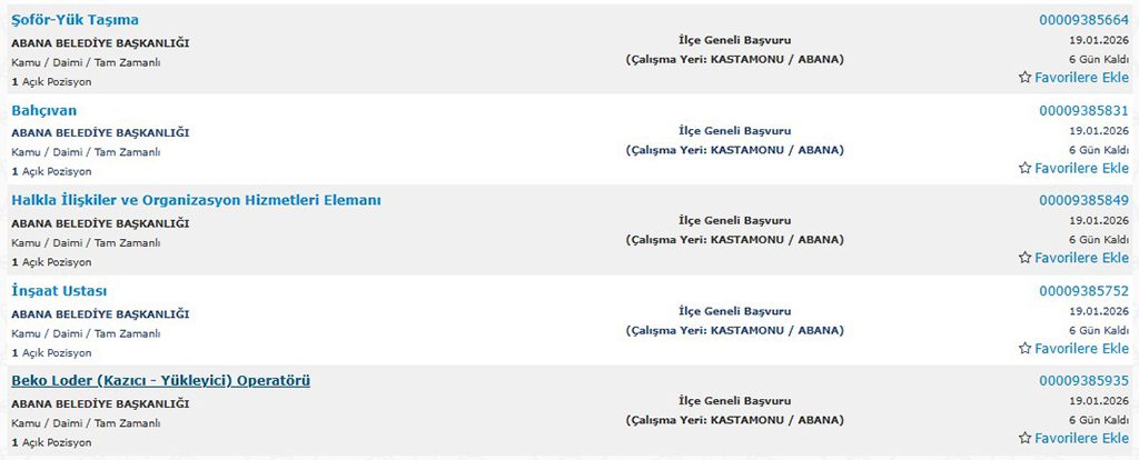 Kastamonu’nun Abana ilçesinde yer alan Kastamonu Abana Belediyesi tarafından yeni bir istihdam daha gerçekleştirilecektir. Türkiye İş Kurumu (İŞKUR) resmi internet sitesi üzerinden yayımlanan ilana göre; Kastamonu Abana Belediyesi 5 personel alımı yapacaktır. Başvurular 19 Ocak 2026 tarihinde sona erecektir. Başvuru şartları, başvuru evrakları, kadro bilgisi ve detayları kamuhaberx.com’da paylaştık.