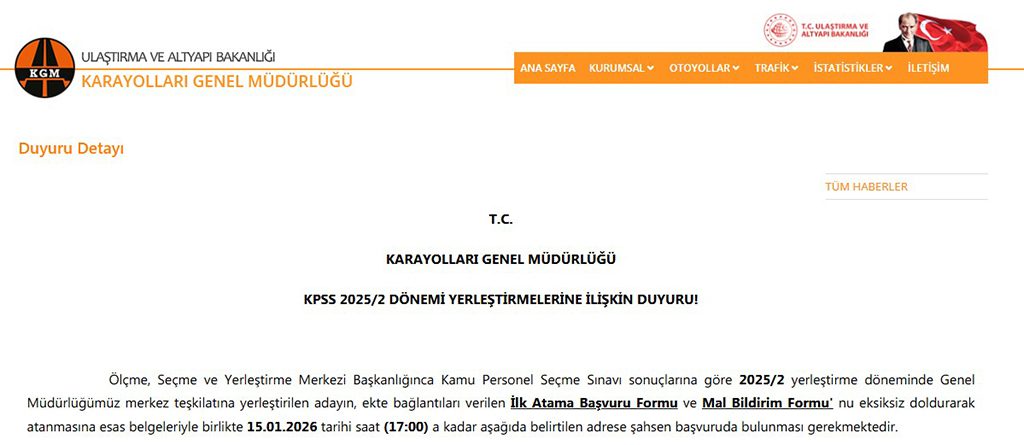Karayolları Genel Müdürlüğü (KGM) resmi internet sitesi üzerinden yeni bir duyuru yayımlandı. Duyuruya göre; KGM KPSS 2025/2 ile atananlardan istenen evraklar açıklandı. Biz de detayları kamuhaberx.com ekibi olarak sitemizden aktarıyoruz.