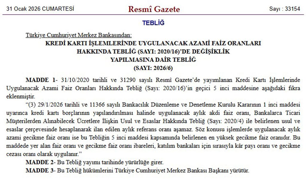 MADDE 1- 31/10/2020 tarihli ve 31290 sayılı Resmî Gazete’de yayımlanan Kredi Kartı İşlemlerinde Uygulanacak Azami Faiz Oranları Hakkında Tebliğ (Sayı: 2020/16)’in geçici 5 inci maddesine aşağıdaki fıkra eklenmiştir. “(3) 29/1/2026 tarihli ve 11366 sayılı Bankacılık Düzenleme ve Denetleme Kurulu Kararının 1 inci maddesi uyarınca kredi kartı borçlarının yapılandırılması halinde uygulanacak aylık akdi faiz oranı, Bankalarca Ticari Müşterilerden Alınabilecek Ücretlere İlişkin Usul ve Esaslar Hakkında Tebliğ (Sayı: 2020/4) ile belirlenen usul ve esaslar çerçevesinde hesaplanarak ilan edilen aylık referans oranı aşamaz. Söz konusu işlemlerde uygulanacak aylık azami gecikme faiz oranı ise bu Tebliğin 5 inci maddesi kapsamında belirlenen en yüksek gecikme faiz oranıdır. Bu maddede yer alan faiz oranı ve gecikme faiz oranı ibareleri, katılım bankaları için sırasıyla kâr payı oranı ve gecikme cezası oranı olarak uygulanır.”