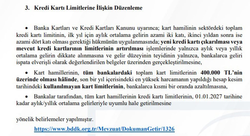 Bankalar tarafından, tüm kart hamillerinin kredi kartı limitlerinin, 01.01.2027 tarihine kadar aylık/yıllık ortalama gelirleriyle uyumlu hale getirilmesine yönelik belirlemeler yapılmıştır.”