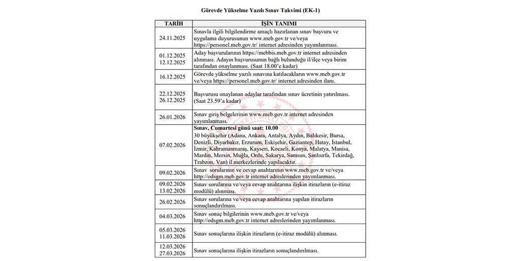7 Şubat 2026 tarihinde Cumartesi günü saat 10:00’da gerçekleştirilecek görevde yükselme yazılı sınavı, 30 ilde gerçekleştirilecektir.