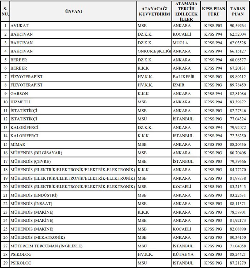 Milli Savunma Bakanlığı 109 memur alımı KPSS taban puanları şu şekildedir;