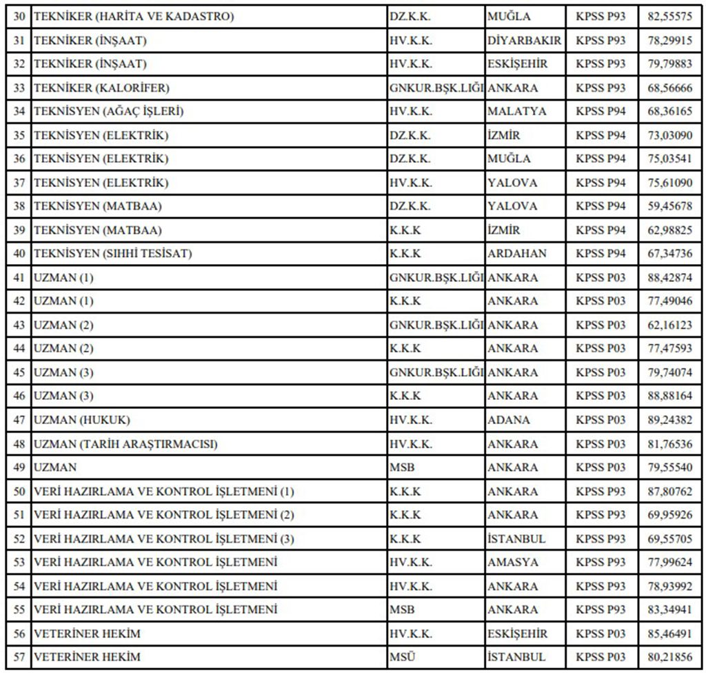 - 30 TEKNİKER (HARİTA VE KADASTRO) DZ.K.K. MUĞLA KPSS P93 82,55575
