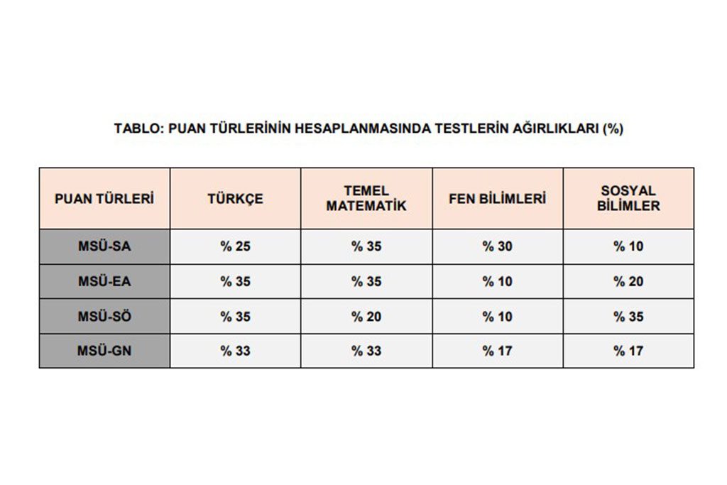 Alt kısımda yer alan tablo üzerinden MSÜ puan türlerinin hesaplanmasında yüzdelik olarak testlerin ağırlıklarını inceleyebilirsiniz.