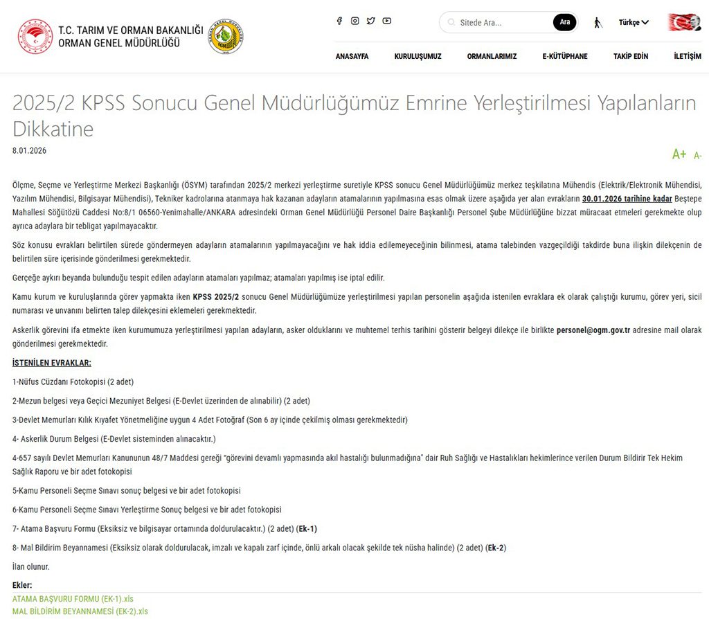 Orman Genel Müdürlüğü resmi internet sitesi üzerinden yayımlanan duyuruya göre; OGM KPSS 2025/2 ile atananlardan istenen evraklar açıklandı. Ataması yapılacak adayların alt kısımda yer alan evrakları 30 Ocak 2026 tarihine kadar teslim etmeleri talep edildi. Biz de kamuhaberx.com ekibi olarak detayları sitemizden paylaştık.