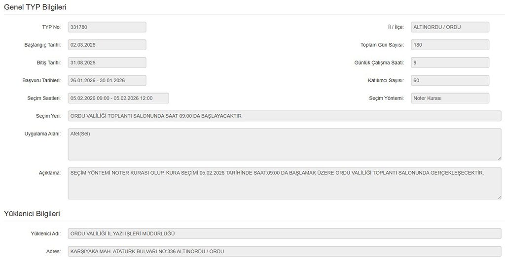 Ordu Valiliği 60 TYP personeli alımı kura çekimi ise; 5 Şubat 2026 tarihinde saat 12:00’de gerçekleştirilecektir ve kura adresi ise; Ordu Valiliği Toplantı Salonu olarak açıklanmıştır.
