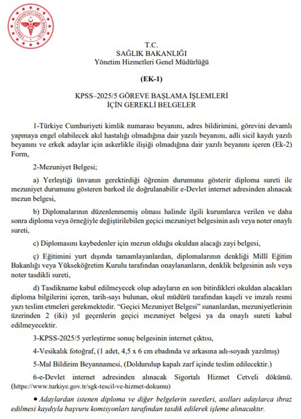 KPSS-2025/5 göreve başlama işlemleri için gereken evrakları alt kısımda görsel olarak paylaşılmıştır.