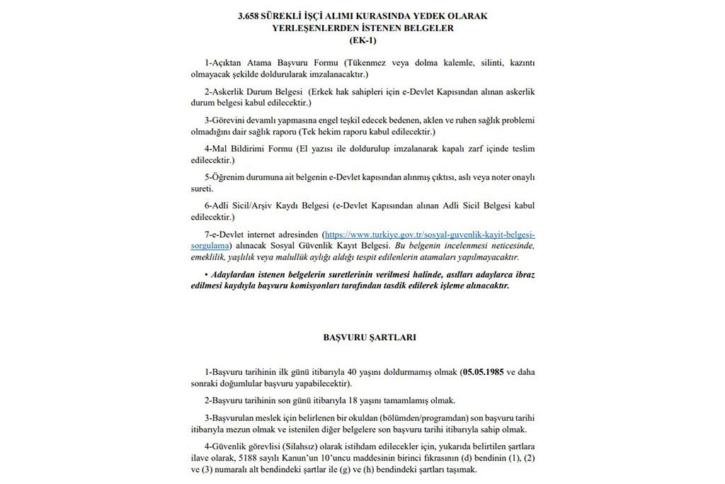 Sağlık Bakanlığı 3.658 sürekli işçi yedek alımı ile ilgili olarak yedek olarak yerleşen adayların sahip olması gereken başvuru şartları ise şu şekildedir;